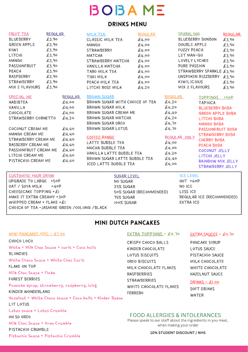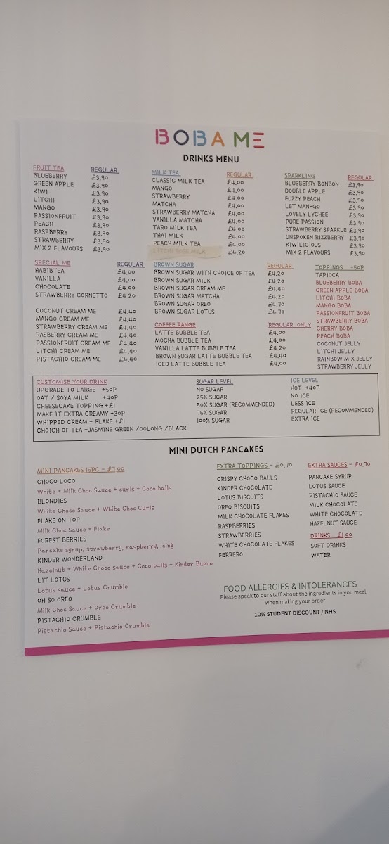 From a reviewer’s perspective, the menu at Boba Me offers a fun and varied selection that should appeal to both classic bubble tea lovers and those looking for something a bit different. The fruit tea range includes refreshing options like Blueberry, Green Apple, Litchi Mango, and Passionfruit, while the milk tea selection features flavorful choices such as Mango, Strawberry, Matcha, Strawberry Matcha, and Vanilla Matcha. For something fizzy, the sparkling series stands out with creative names like Blueberry Bonbon, Double Apple, Fuzzy Peach, Let Man-Go, and Lovely Lychee. The menu also goes beyond drinks with mini Dutch pancakes, including Lit Lotus, Oh So Oreo, and Pistachio Crumble, which make for a sweet treat alongside a drink. The drinks menu further includes staples like Classic Milk Tea, Mango, Strawberry Matcha, and Strawberry Matcha, while the “Others” section offers interesting options such as Habibtea, Vanilla, Brown Sugar Milk, Chocolate, and Brown Sugar Cream Me. Overall, the menu feels playful, modern, and well-suited for anyone looking for colorful drinks and dessert-style snacks in one place.